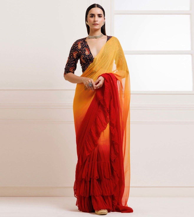 Orange-Red Pleated Ombre Chiffon Saree