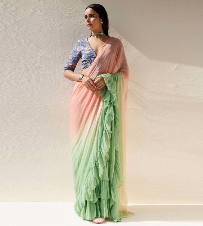 Green-Peach Pleated Ombre Chiffon Saree