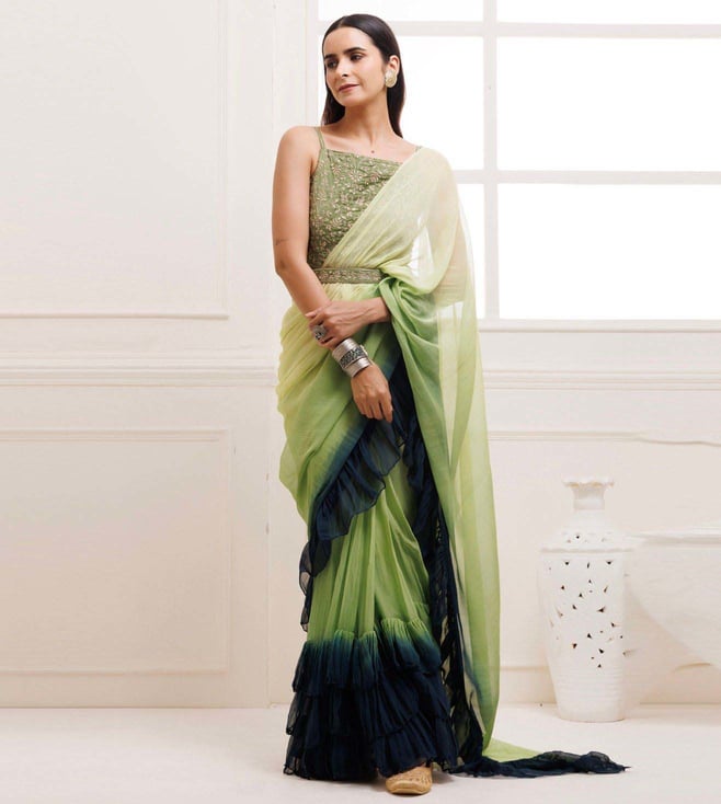 Prussion Blue-Green Pleated Ombre Chiffon Saree with Stitched Blouse