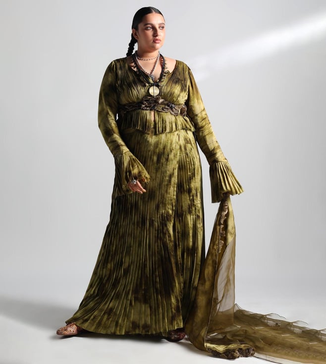 Multicolored The Gaze Couture 22 Marshscapes Pleated Skirt with Blouse and Dupatta
