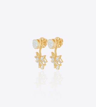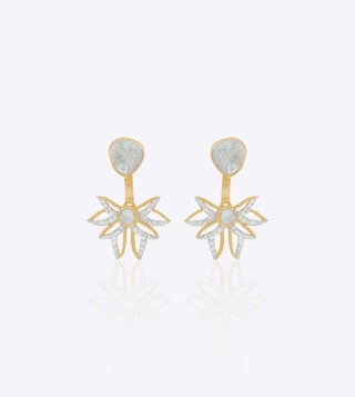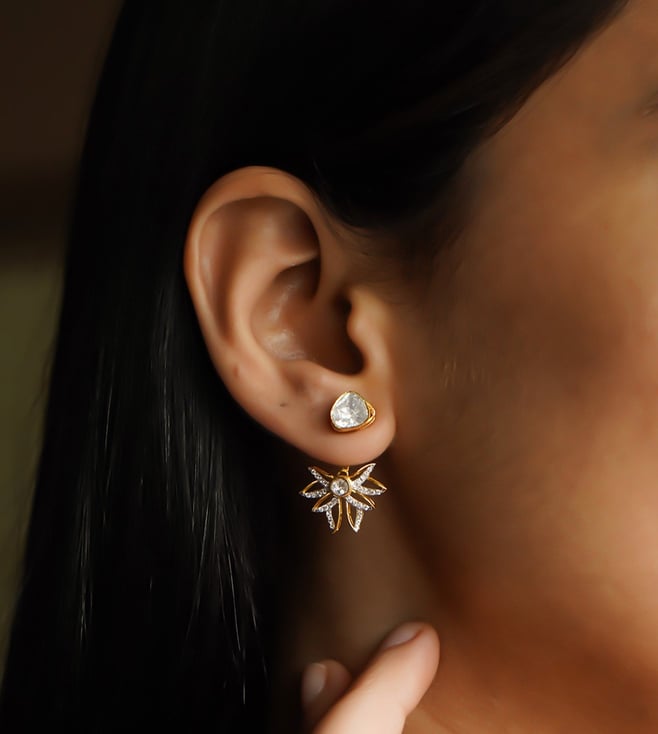 The Astra Jacket Earrings in 14k gold feature Polki diamonds arranged in a starburst design, blending celestial inspiration with timeless artistry. Styling Tip Style them with cocktail dresses or festive attire for a striking, modern meets traditional statement.