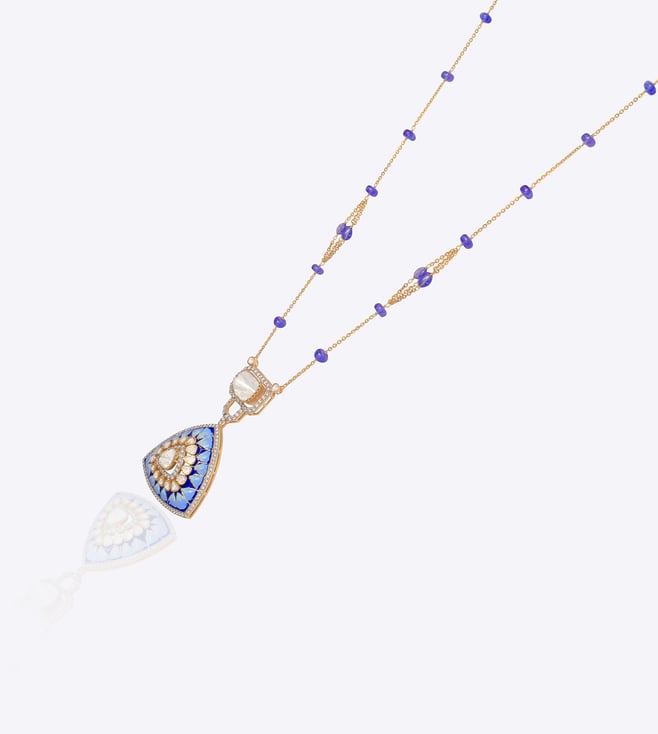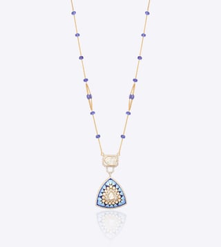 A bold 14k gold triangle pendant with turquoise and deep blue enamel waves, centered by a rectangular Polki framed in diamonds. Tanzanite beads along the chain add cool, oceanic allure to this striking design. Styling Tip Pair with solid tones or deep necklines to let its vivid colors shine.