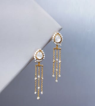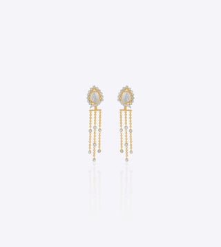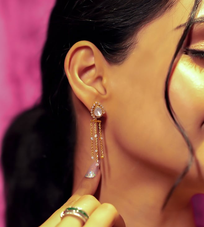 Pear shaped Polki with diamond chains in 14k gold create a cascade like sparkling raindrops. These ear jackets offer two looks¿elegant studs by day or full drops by night. Styling Tip Keep it minimal for daytime chic, then attach the jacket for fluid, dazzling evening drama.