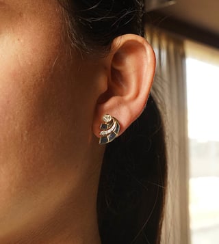 The cosmic swirl earrings capture a celestial dance of light. Crafted in 14kt gold, these earrings feature a unique swirling design with a luminous Polki stone at the center, accented by a curved line of diamonds and vibrant colored stones.