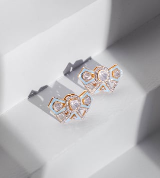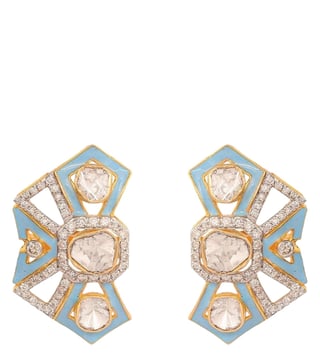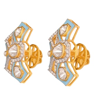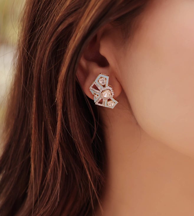 Experience timeless elegance with Polki stories elena Polki diamond earrings. Adorned with dazzling Polki diamonds and vibrant blue enamel, these earrings blend traditional charm with modern design. Their intricate geometric pattern and shimmering diamonds create a captivating contrast, making them a perfect choice for both formal and casual occasions. Elevate your collection with this exquisite piece.