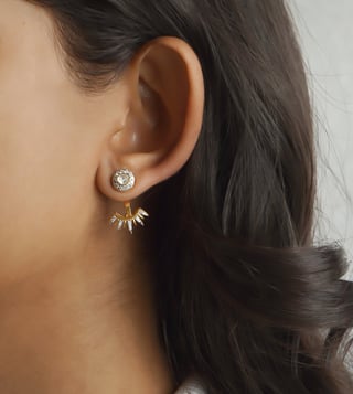 This ear jacket is crafted in radiant 14k yellow gold, featuring a distinctive dual-part design that elegantly frames the ear. The Stud showcases a sparkling round Polki diamond encircled by a halo of pave diamonds & lower jacket element bursts outward in a dynamic array of diamond-laden spikes. Styling Tip Pair it with a sleek hairstyle such as a low bun or side-swept waves to fully showcase the unique jacket design.