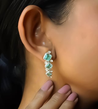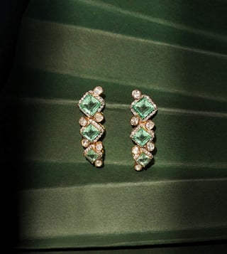 A symphony of soft green and shimmering diamonds, these 14k gold earrings feature a graceful cascade of emerald-cut gemstones framed in brilliance. Their fluid silhouette makes them perfect for evening galas, intimate gatherings, or elegant celebrations.