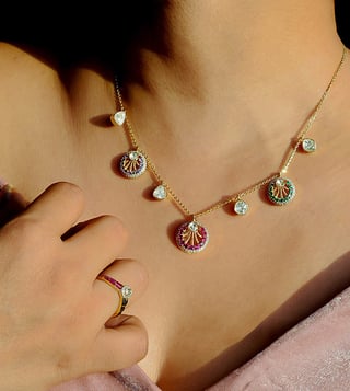 A mesmerizing play of color, the aurora floral necklace showcases floral medallions adorned with uncut Polki diamonds, vibrant enamel detailing, and a delicate 14k gold chain. Accented with shimmering Polki droplets, this piece is perfect for festive celebrations and elegant soirees.