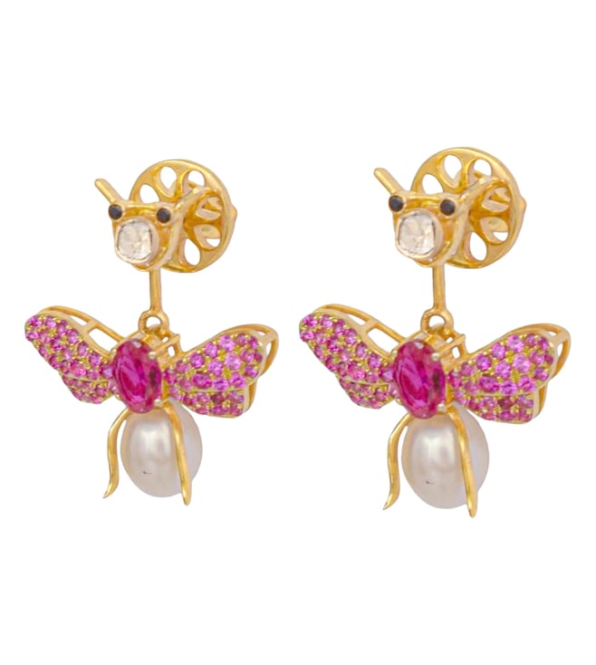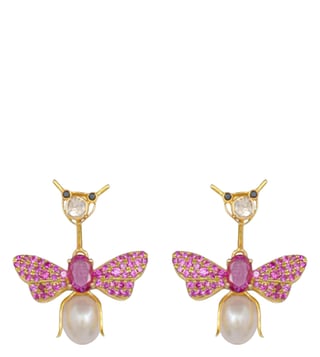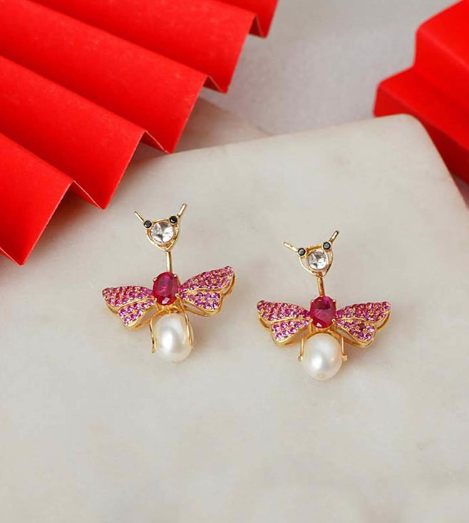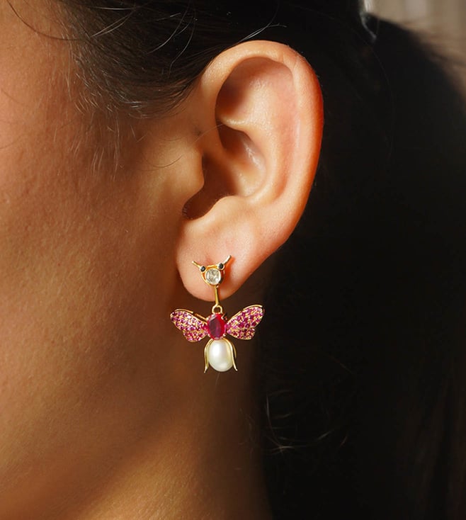 A touch of sparkle and a dash of elegance, the queen bee earrings are a true treasure. The dazzling pink gemstones, set against the backdrop of the bee's delicate 14kt gold form, create a captivating contrast with the luminous pearl droplets.