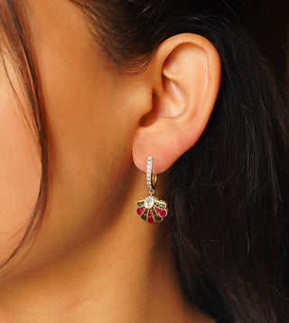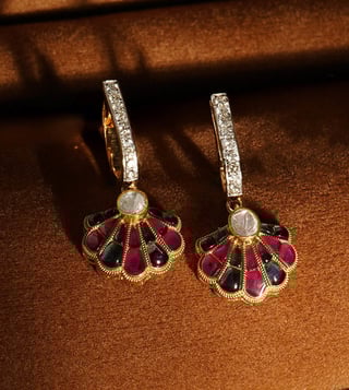 Inspired by the serenity of the sea, the sea shell earrings feature intricate enamel detailing, uncut Polki diamonds, and brilliant-cut diamonds set in a graceful shell silhouette. A perfect blend of elegance and coastal charm, these earrings add a touch of oceanic beauty to any ensemble.