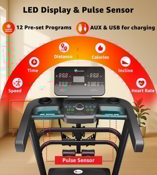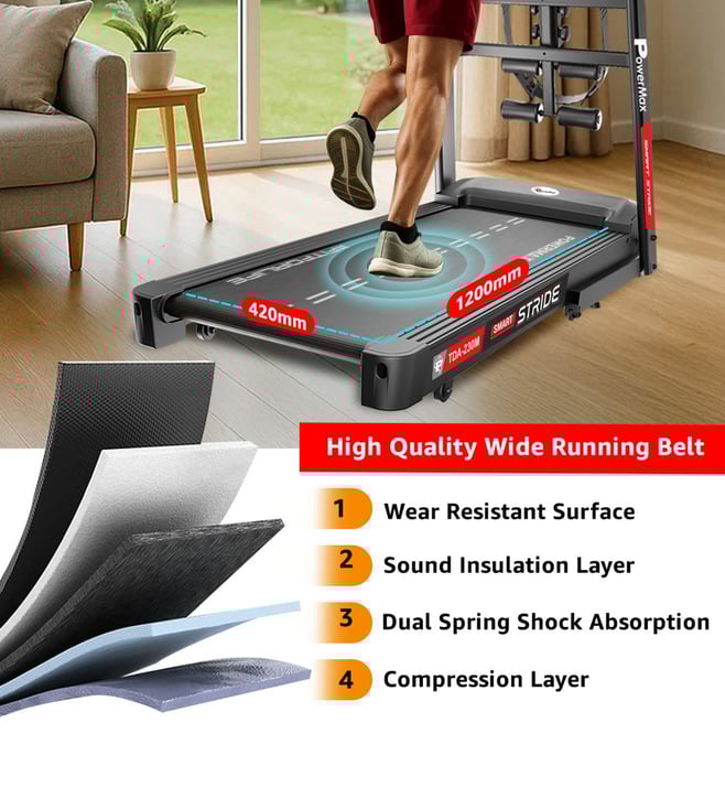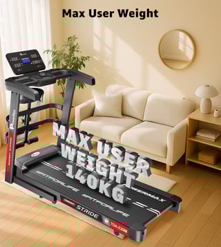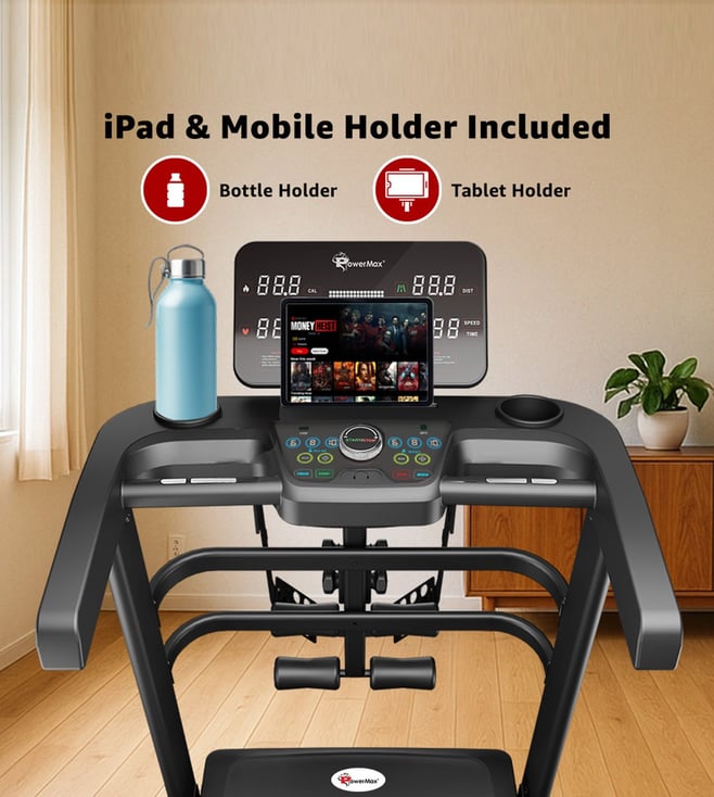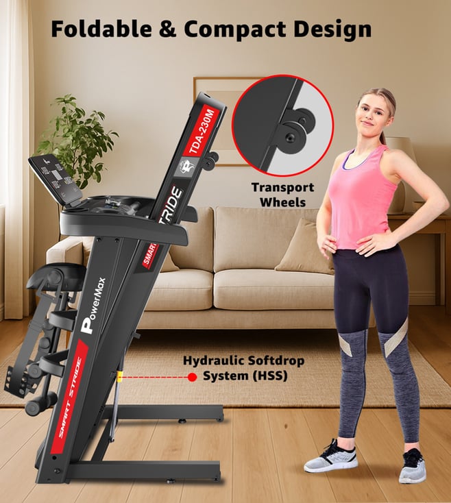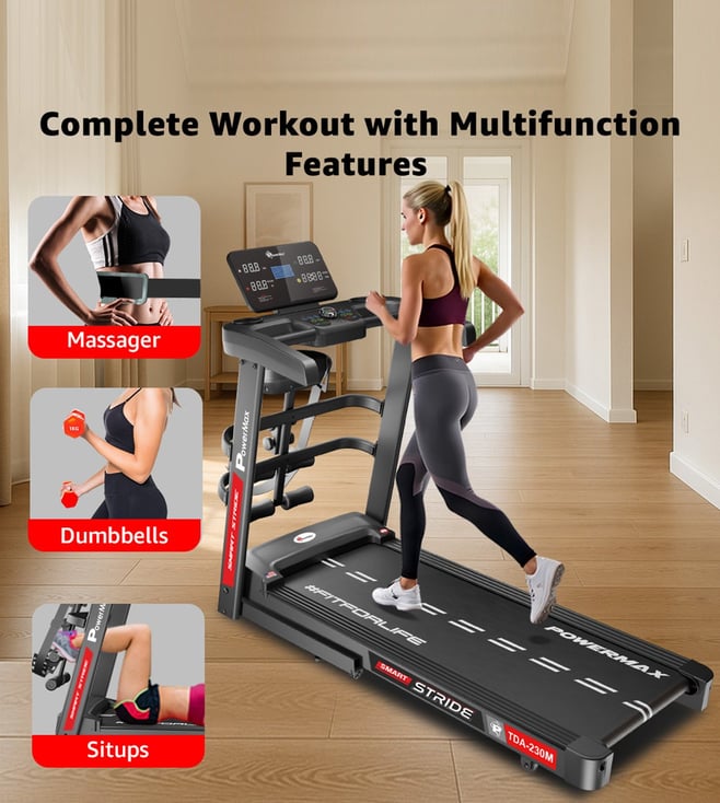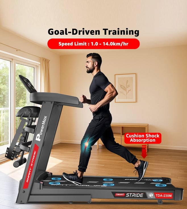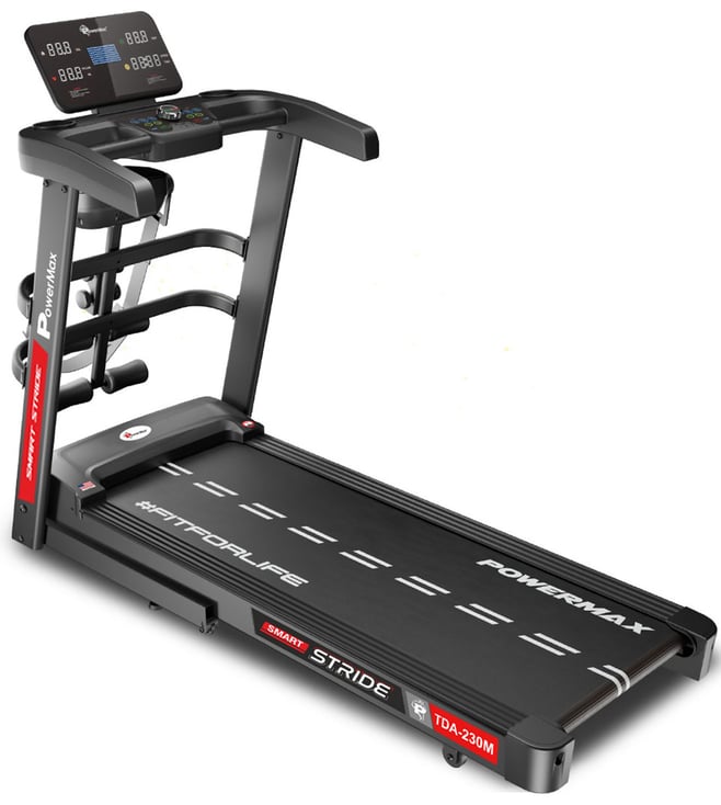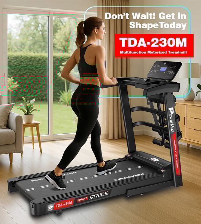 The PowerMax TDA-230M features a powerful 5 HP peak DC motor, 15-level auto incline, and a wide 1200x420mm running surface with shock absorption. Track time, speed, distance, calories, and pulse on the 5-window LED display. With 12 preset workouts, pulse sensors, foldable design, and 140 kg user capacity, it¿s perfect for home fitness.