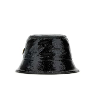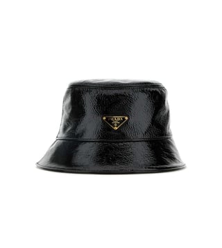 Black naplak bucket hat from Prada logo plaque baseball cap in patent leather. Flat crown quilted dropped brim front logo plaque.