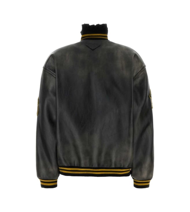 Prada Black Leather Bomber With Patch Regular Fit Jacket