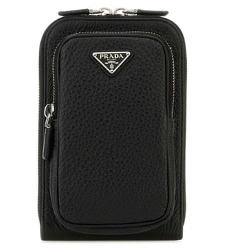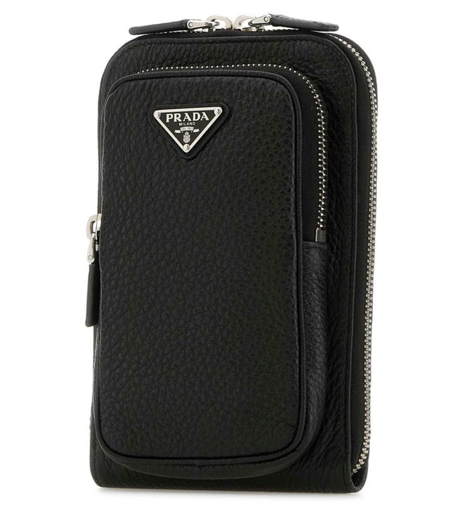 Black leather phone case featuring iconic enameled metal triangle logo plaque on the front, shoulder strap, zip closure.width: 12 cm height: 18 cm depth: 2 cm min shoulder strap length: 36 cm max shoulder strap length: 68 cm Products purchased from Darveys are supported exclusively by the warranty/exchange policies of Darveys and its partner boutiques. Brand owners and their channel partners are not responsible for exchange/warranty services for items purchased through Darveys.