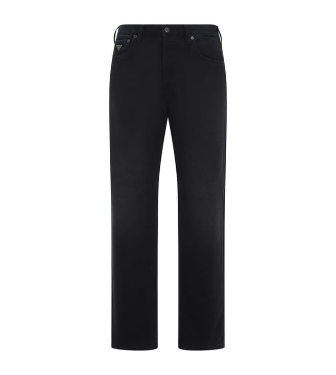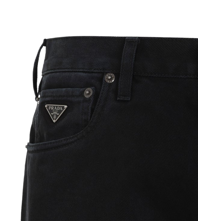 Elevate your style with the Prada Black Straight Fit Jeans. Prada black cotton jeans. crafted from black cotton denim, midwaist, belt loops, 5pockets design, enamelled triangle logo detail, front button and flyzip fastening, back sliding tab and branded leather label, straight leg.