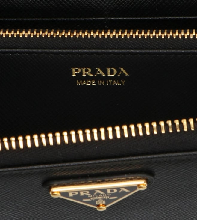 Prada zip-around wallet in saffiano leather with a zip closure and a triangle logo. w 20 x h 10.5 x d 2 cm Products purchased from Darveys are supported exclusively by the warranty/exchange policies of Darveys and its partner boutiques. Brand owners and their channel partners are not responsible for exchange/warranty services for items purchased through Darveys.