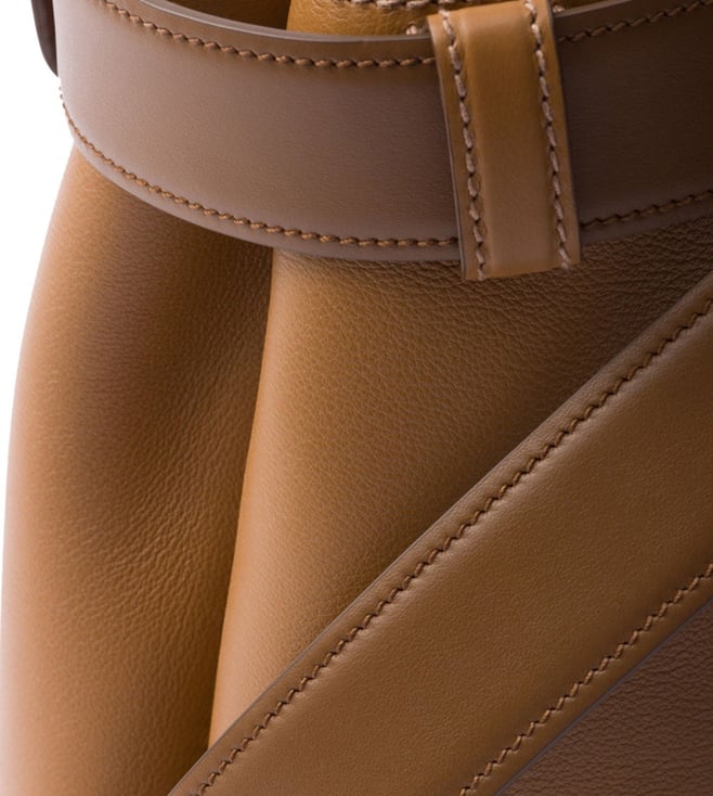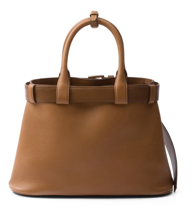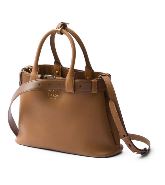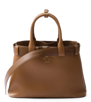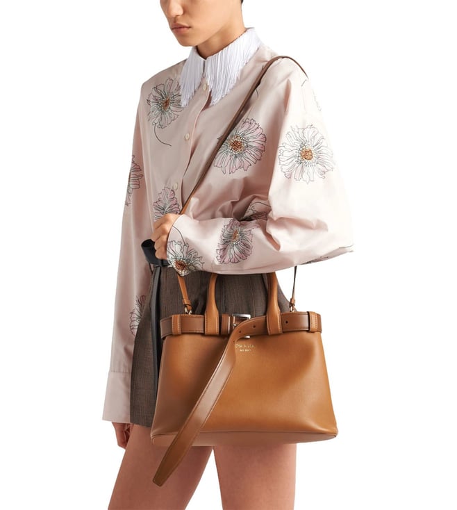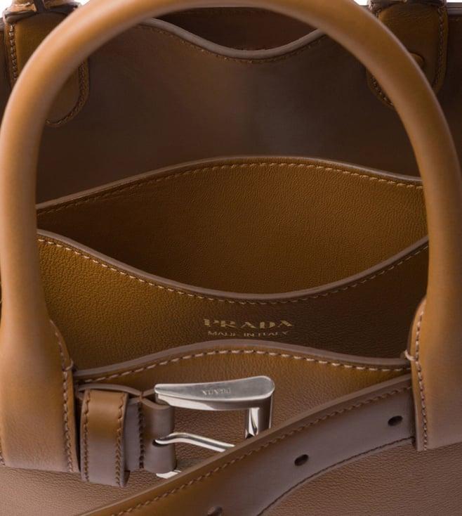 Expand the collection of your accessories in a trendy way with this bag from Prada. Brownnappa leathertwo rolled to handleshandle holderdetachable beltlogo stamp to the frontopen toppartitioned compartmentsilver-tone hardware Products purchased from Darveys are supported exclusively by the warranty/exchange policies of Darveys and its partner boutiques. Brand owners and their channel partners are not responsible for exchange/warranty services for items purchased through Darveys.