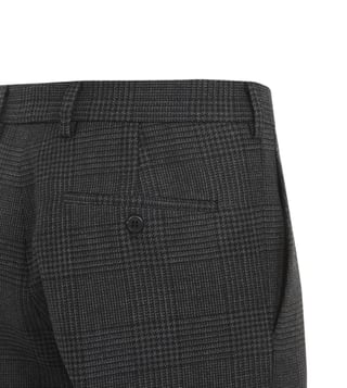 Elevate your style with the Prada Dark Grey Checked Straight Fit trousers. Prada grey wool pants. greey checkered houndstooth wool, belt loops, front concealed closure, slant pockets, welt pockets with buttons on the back, central loose creases, regular fit, straight leg.