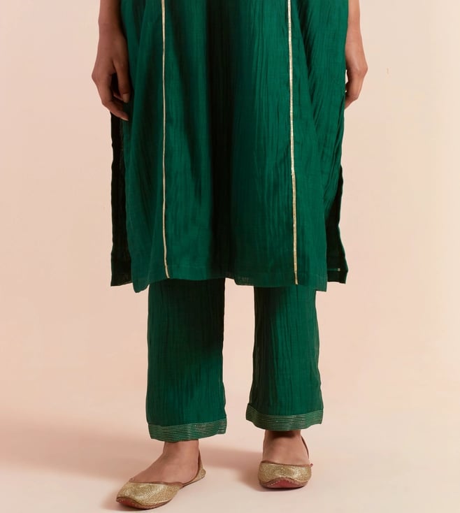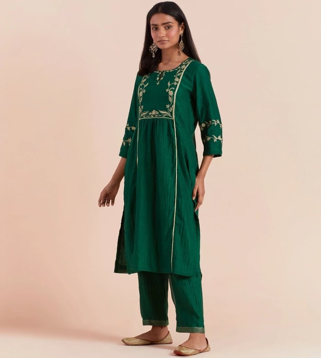 Priya Chaudhary Green Tyohar Embroidered Chanderi Silk Kurta With Pants - Set Of 2