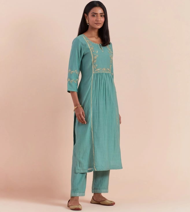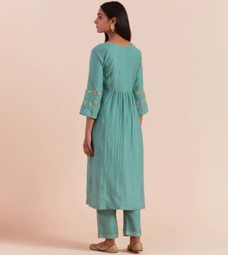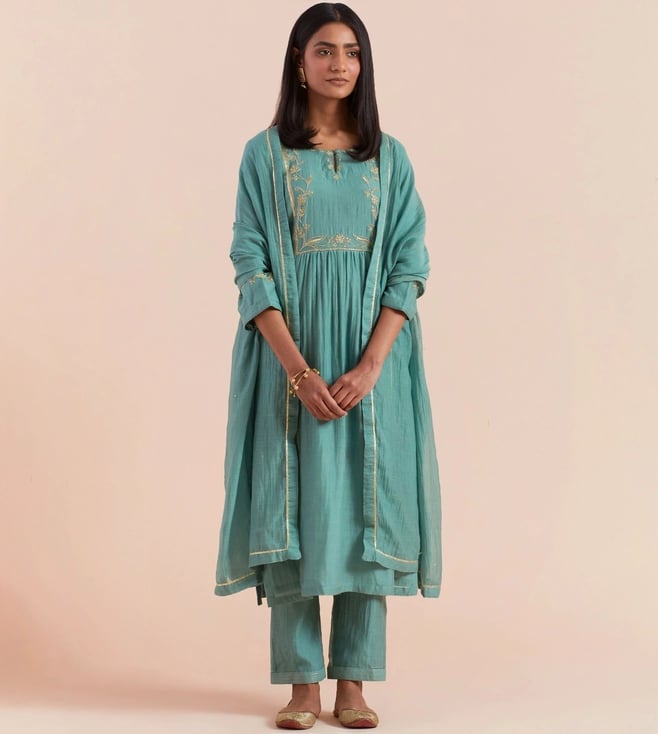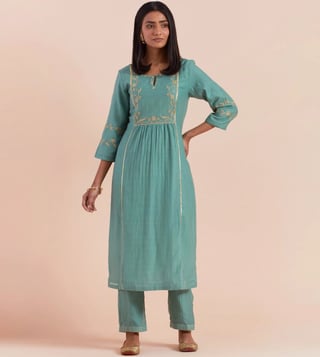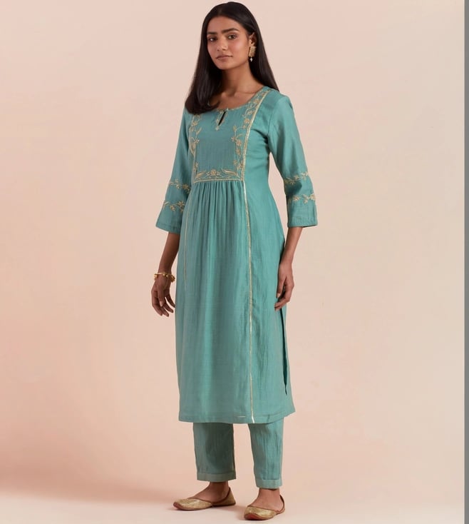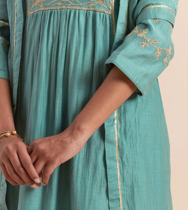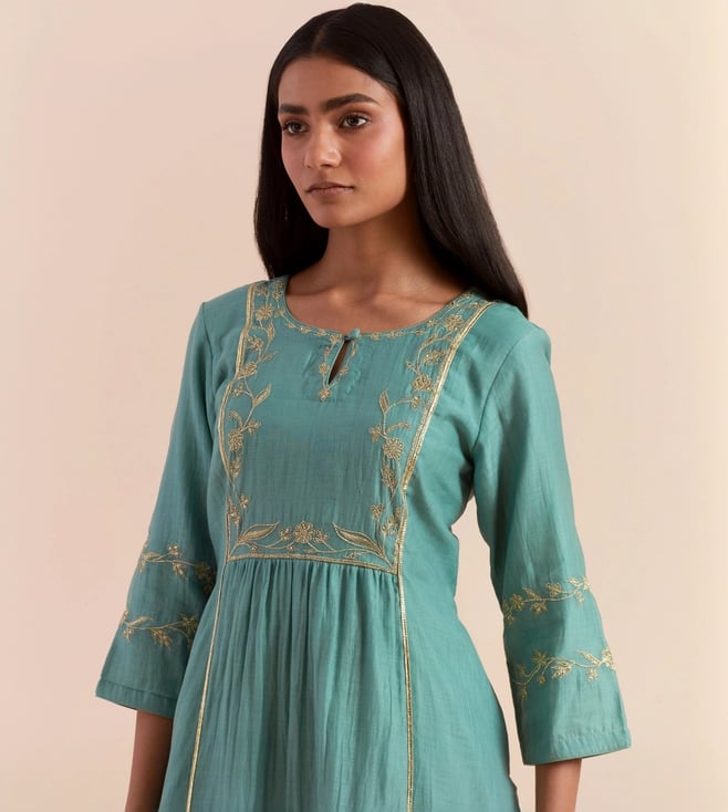 Priya Chaudhary Teal Blue Tyohar Embroidered Chanderi Silk Kurta With Pants - Set Of 2