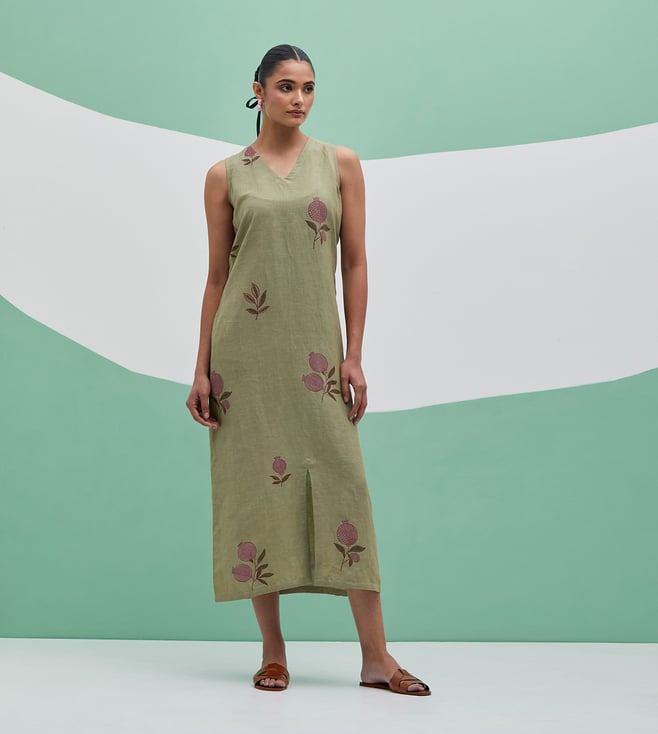 Olive Green Umber Solid Jumpsuit In Cotton Linen Fabric and a Sleeveless Over Wear