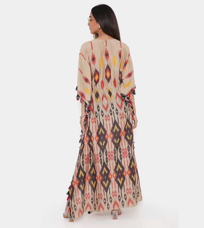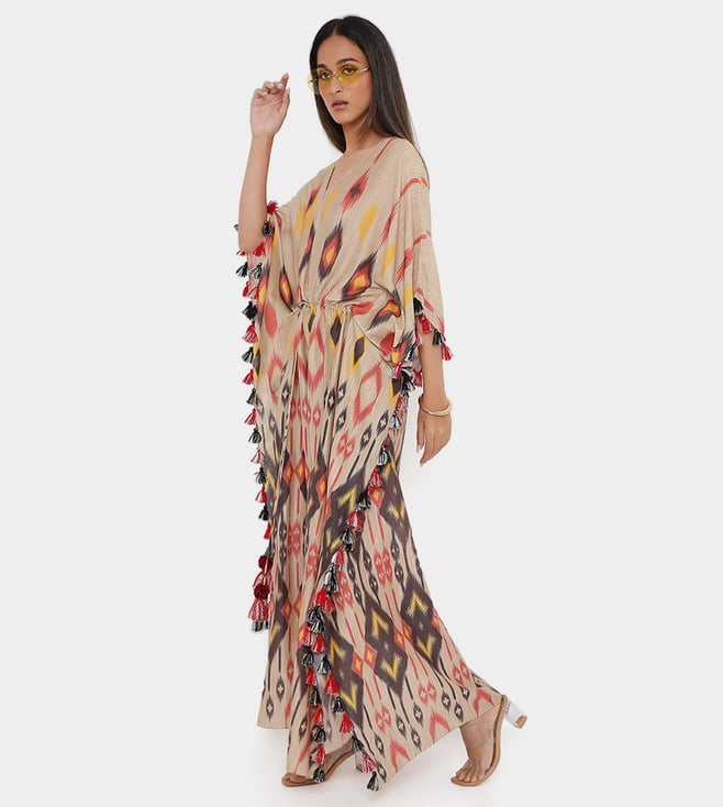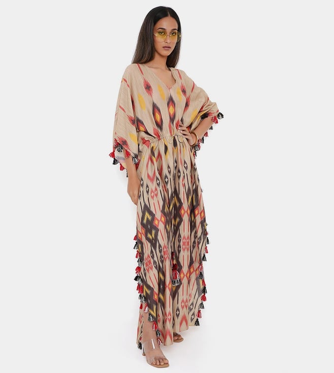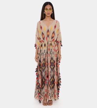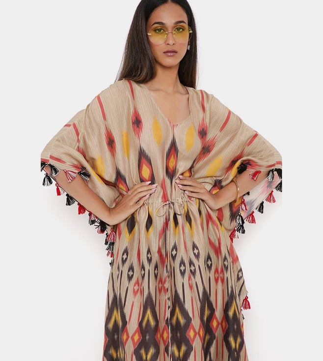 Get hold of an impeccable look by donning this kaftan. Tailored to sartorial perfection from silkmul, it assures a soft and soothing touch against the skin. Disclaimer: Product colour may slightly vary due to photographic lighting sources. Country of Origin - India.
