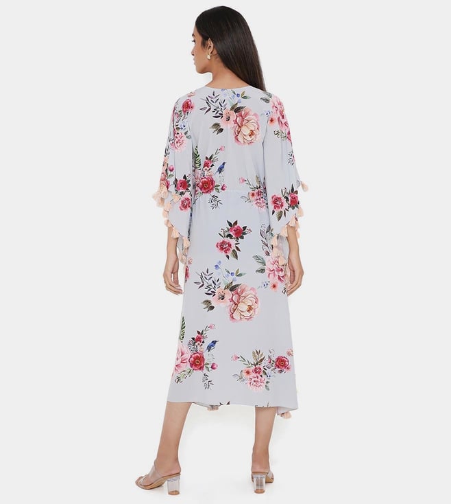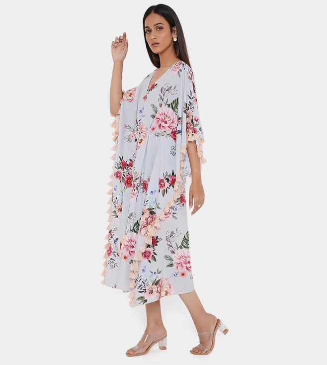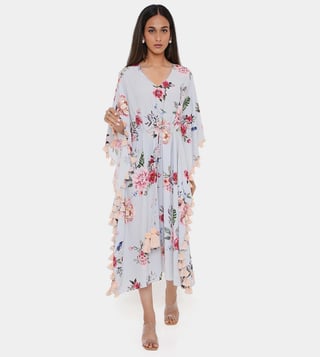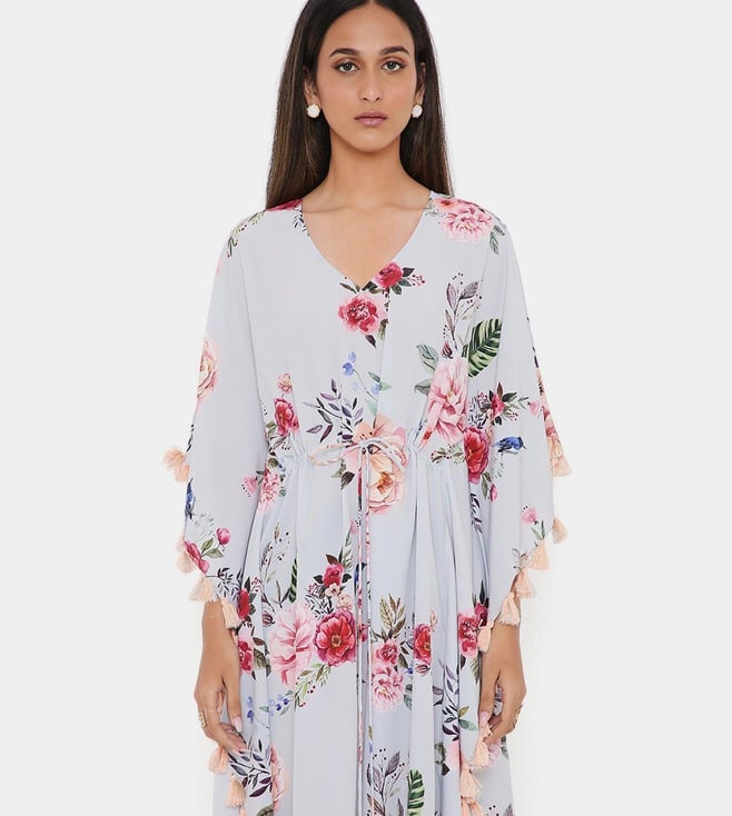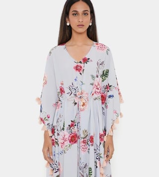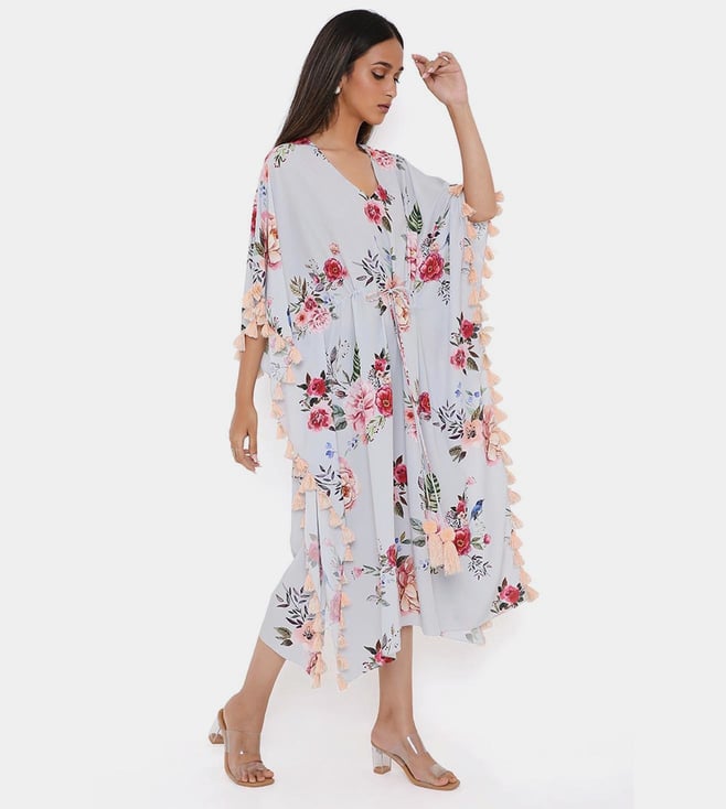 Grey Gulabi Print Art Crepe Kaftan With Tassels