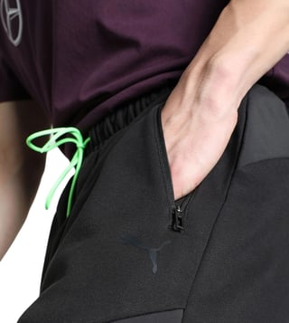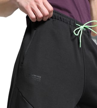 Take team spirit beyond the grid with the Puma x Mercedes-AMG Petronas F1 joggers. Part of the new collection, these joggers feature an elasticated waist with external drawcords for customizable comfort. Contrast color drawcords, side zipped pockets, and closed cuffs add functional details, while decorative panels and a fabric mix enhance visual interest. The Mercedes-AMG Petronas F1 logo and Puma cat on the front showcase your allegiance with style.