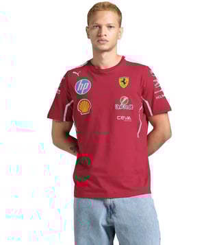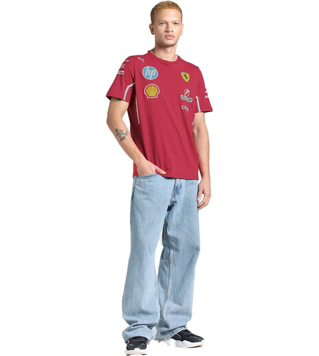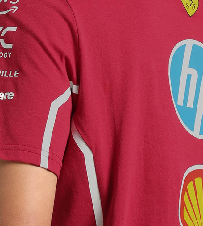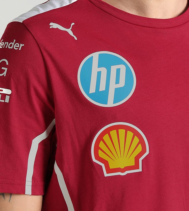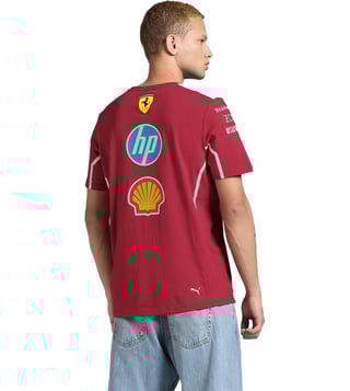 Elevate your style with the Puma Dark Cherry Scuderia Ferrari Print Regular fit T-Shirt. Embrace the sleek sophistication of Ferrari's iconic design combined with Puma's superior quality and comfort. This t-shirt is the perfect blend of fashion and function, making it a must-have for any motorsport enthusiast or fashion-forward individual. Stand out from the crowd and show your passion for speed and style with this effortlessly cool and versatile t-shirt.
