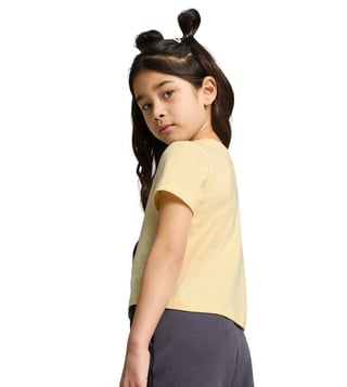 Get ready to brighten up your little ones wardrobe with the Puma Girls Yellow Trolls Graphic Regular Short T-Shirt. This vibrant and playful top features a fun Troll print that is sure to bring a smile to any childs face. Made with high-quality materials, this shirt is not only stylish but also comfortable for all-day wear. Perfect for playdates or casual outings, this t-shirt is a must-have for any young fashionista. Add a pop of color and fun to her closet with this adorable Puma t-shirt