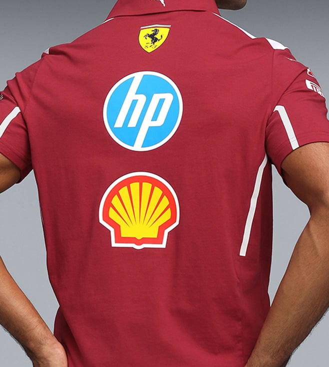Elevate your casual style with the puma maroon Ferrari regular fit t-shirt. This sleek and sporty tee seamlessly combines the iconic puma brand with the legendary Ferrari design, making it a must-have for any fashion-forward individual. Crafted with high-quality materials, this t-shirt offers a comfortable regular fit that is perfect for everyday wear. Whether you are hitting the gym or running errands, this shirt will keep you looking effortlessly cool and stylish. Upgrade your wardrobe with this dynamic collaboration piece that exudes both performance and luxury.