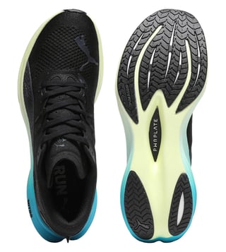 Puma Men's Black & Speed Blue Deviate NITRO 3 Running Shoes. Engineered for propulsion, these feature NITROFOAM and PWRPLATE for responsiveness. Mesh upper with 20% recycled materials ensures breathability. With a 10mm heel-to-toe drop and 270g weight, they're ideal for neutral pronators seeking speed and comfort.