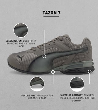 These sleek running shoes take the famed Puma Tazon design style to a whole new level. But as bold and eye-catching as the design is, these shoes are engineered to give you the lightweight performance and support you demand. There is a TPU shank for added support and an EVA heel piece for long-lasting comfort. Get out there and make your next run count.