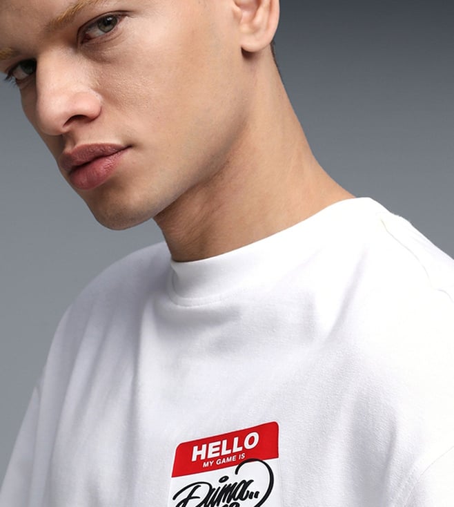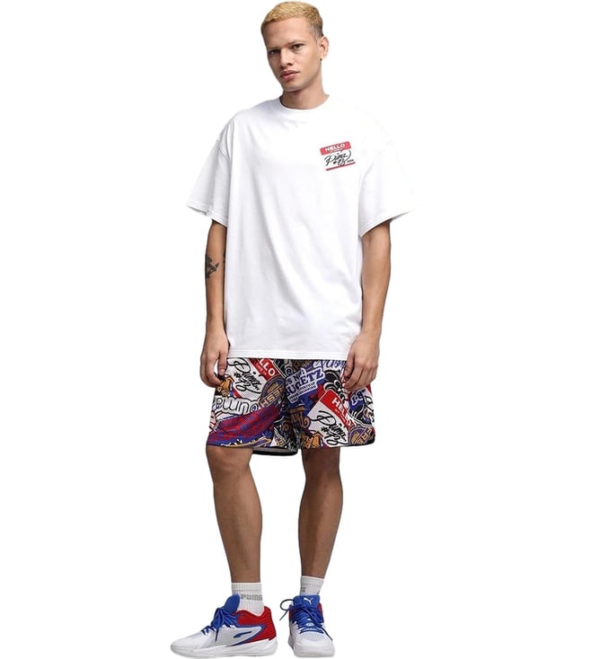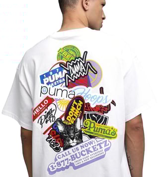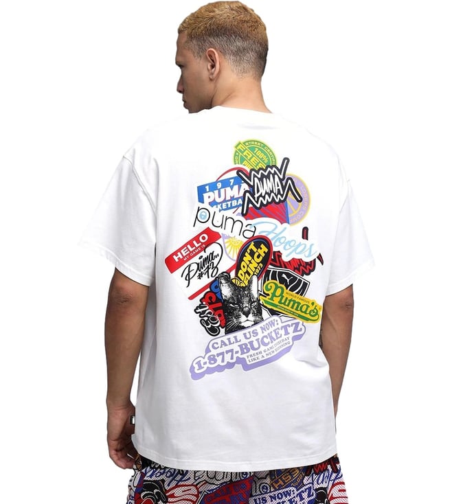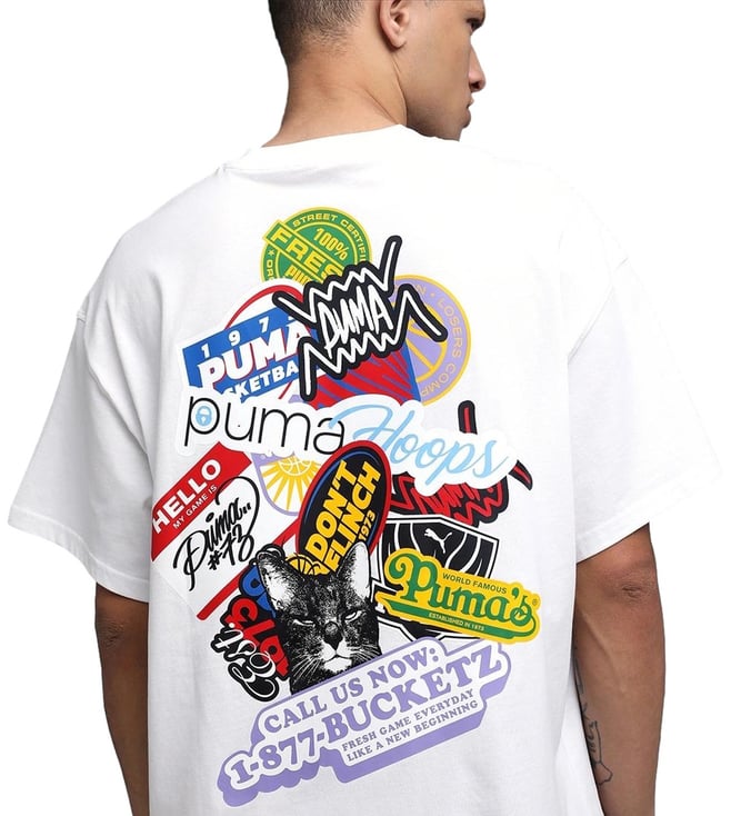 Elevate your street style with the Puma White HOOPERS HOTLINE Printed Relaxed Fit Oversized Basketball Tee. Made for comfort and style, this oversized tee features a relaxed fit for ultimate comfort and a bold graphic print for a trendy look. Whether you're hitting the court or the streets, this tee will keep you cool and stylish all day long. Stand out from the crowd and show off your love for basketball with this must-have wardrobe staple.