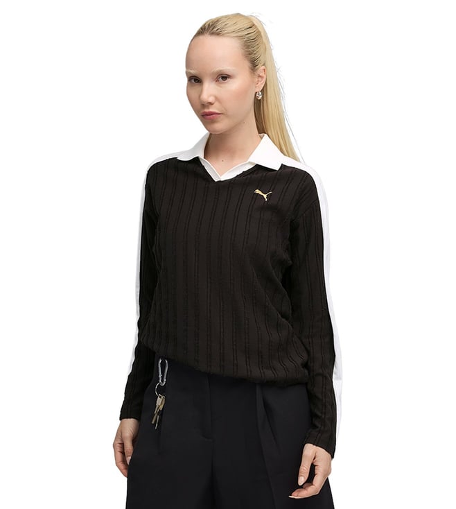 Black T7 FAMILY Striped Relaxed Fit Polo T Shirt