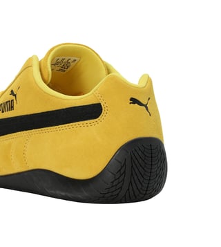 Puma Unisex Pele Yellow, Black Speedcat OG Sneakers. A racing and street style icon, these sneakers feature a leather upper, suede Formstrip, and IMEVA for lightweight comfort. Sourced via the Leather Working Group, they offer neutral pronators a sleek, versatile design for vibrant, everyday wear.