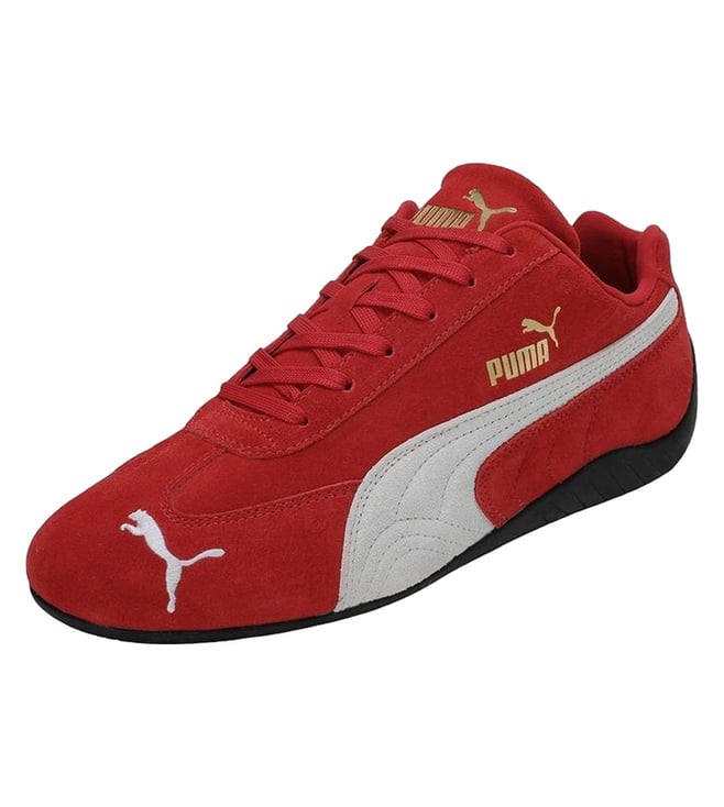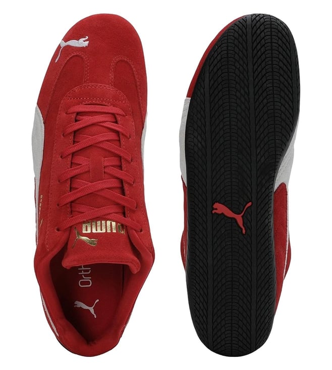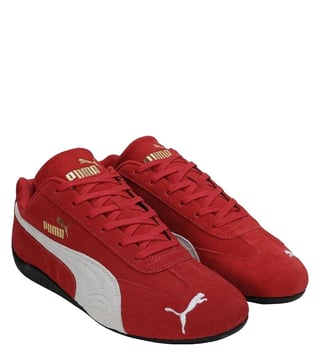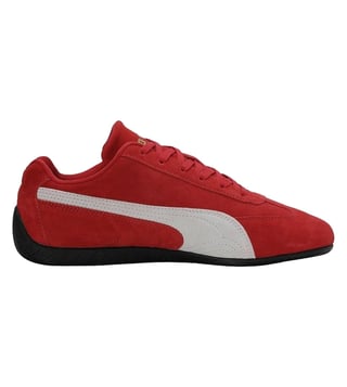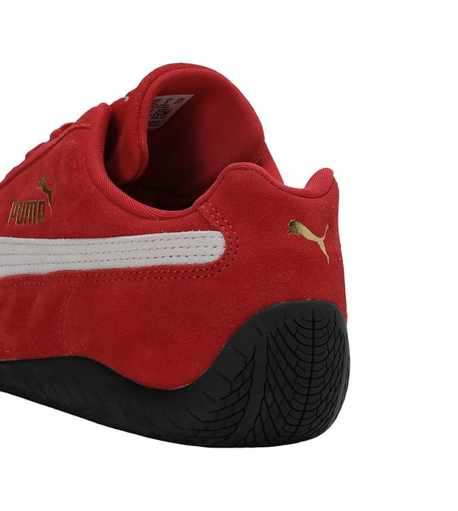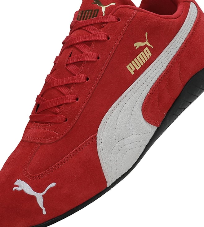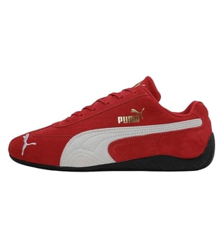 Puma Unisex Red, White Speedcat OG Sneakers. An iconic blend of racing and street style, these sneakers feature a leather upper, suede Formstrip, and IMEVA for lightweight comfort. Sourced via the Leather Working Group, they offer neutral pronators a sleek, versatile design for bold, everyday wear.