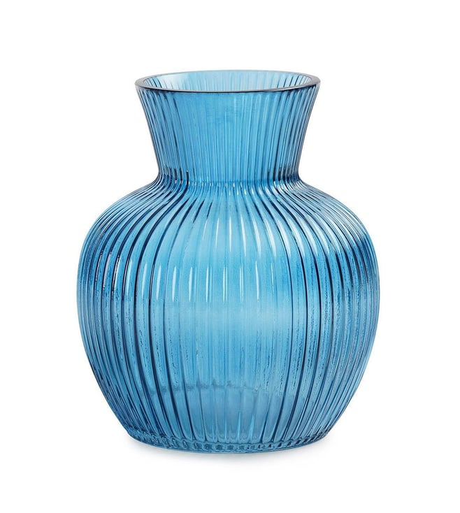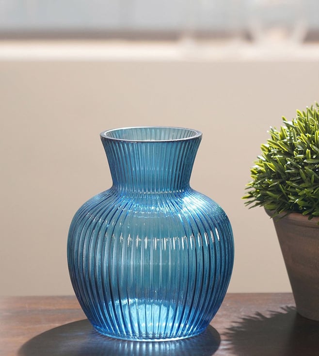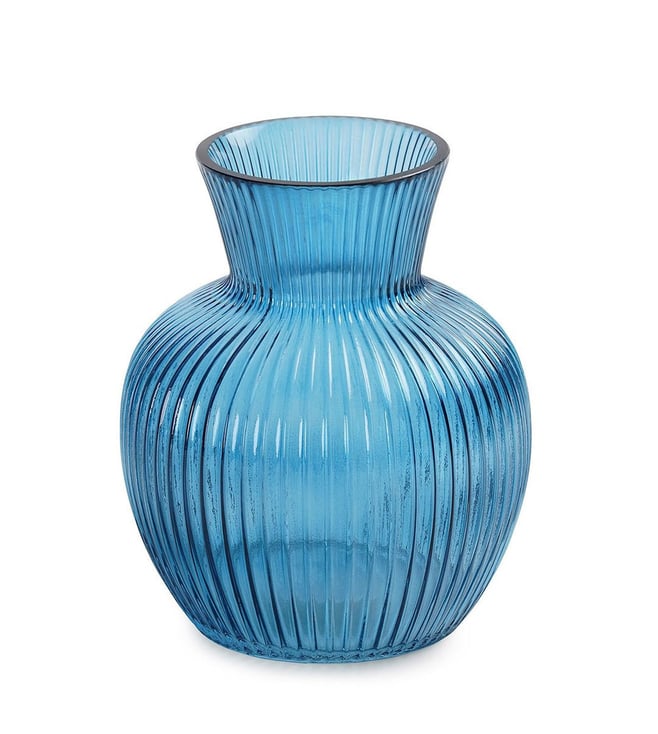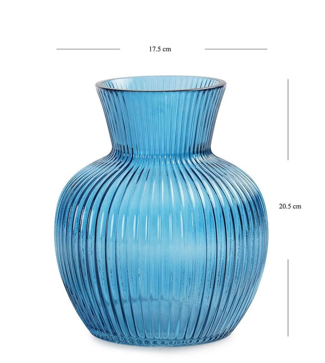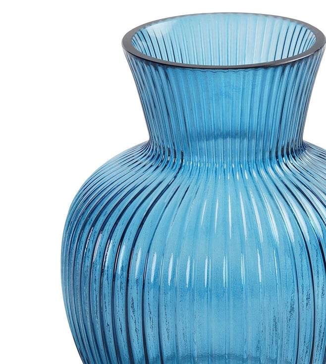 Elevate your home decor with these stunning blue glass vases from Pure Home and Living. Their unique design and vibrant color will add a touch of elegance to any room. Disclaimer: All other items in the image are only for display purposes and will not be a part of the delivery content. Product colour may slightly vary due to photographic lighting sources. Country of Origin - India.