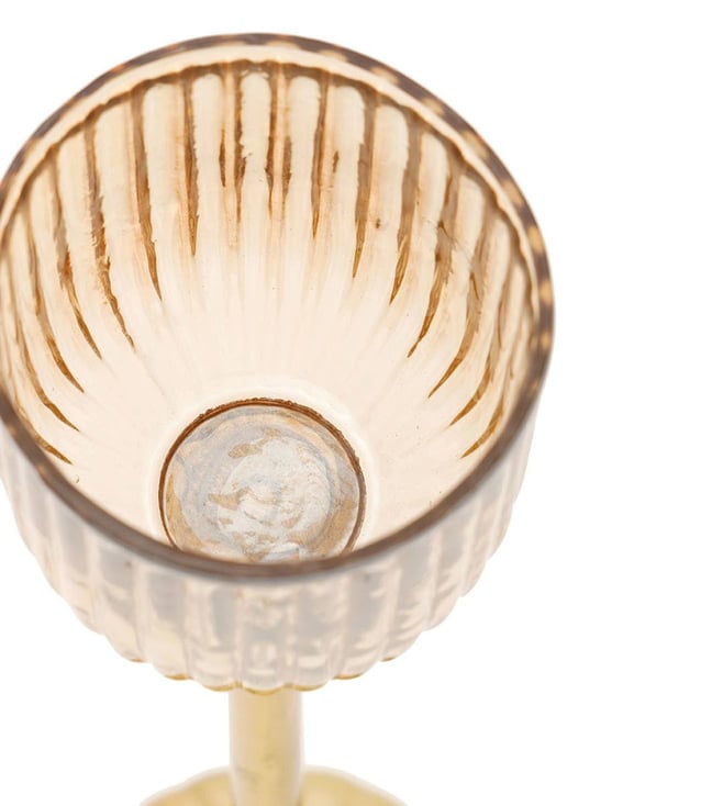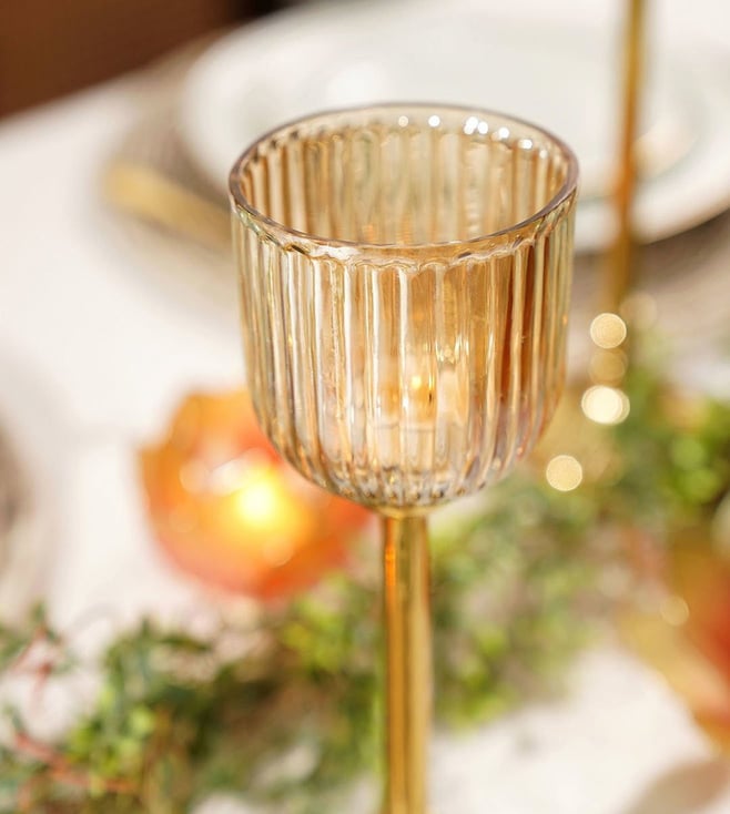 With a dash of color and a visually appealing structure, this set of 1 tall hurricane votive with stand from Pure Home and Living will be an ideal decorative accessory for your home. It features a ribbed texture and a sturdy gold stand. This standout piece will add texture and height to your setting, whilst completing the look with its elegance. It is crafted from glass.