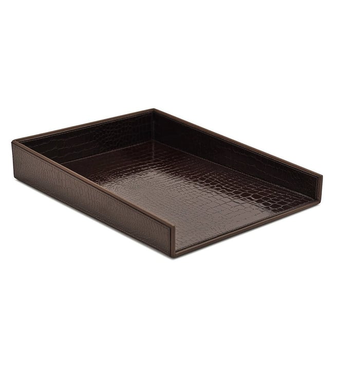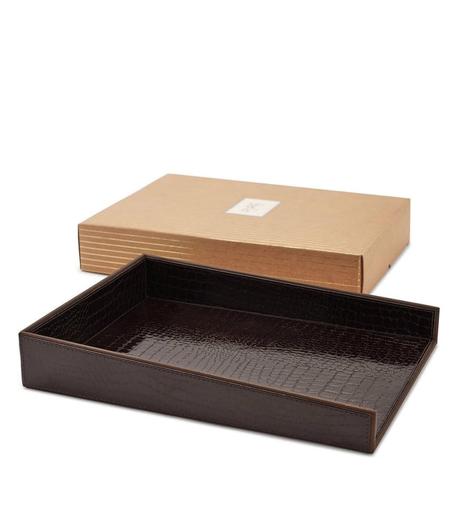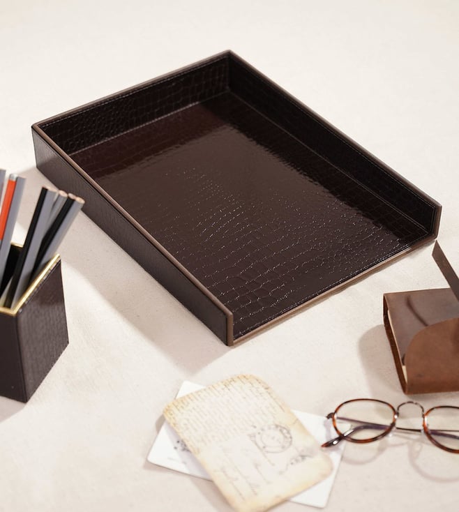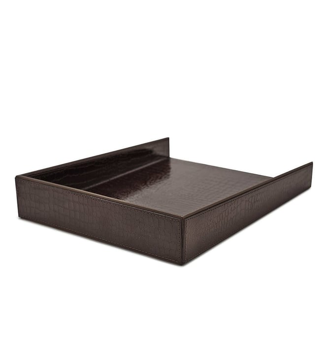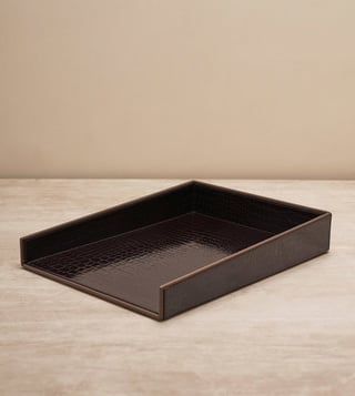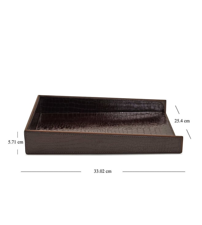 Add a touch of elegance to your home with Pure Home and Living's Brown Leather Textured Paper Tray. Made with faux leather, it's perfect for any occasion. Upgrade your home decor with this luxurious accessory.' Disclaimer: All other items in the image are only for display purposes and will not be a part of the delivery content. Product colour may slightly vary due to photographic lighting sources. Country of Origin - India.