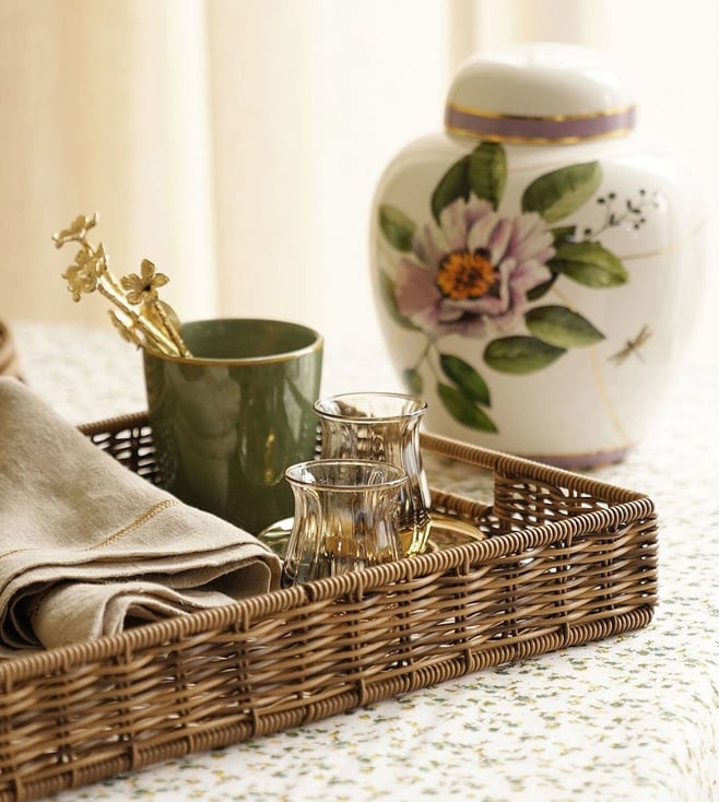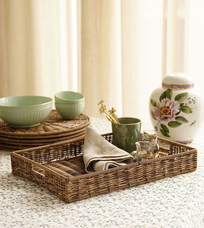 Brown plastic wicker tray from Pure Home and Living. Ideal for New Year, Diwali, Mother's Day, weddings, birthdays, or anniversaries. Stylish and practical.Disclaimer: All other items in the image are only for display purposes and will not be a part of the delivery content. Product colour may slightly vary due to photographic lighting sources. Country of Origin - India.