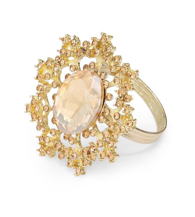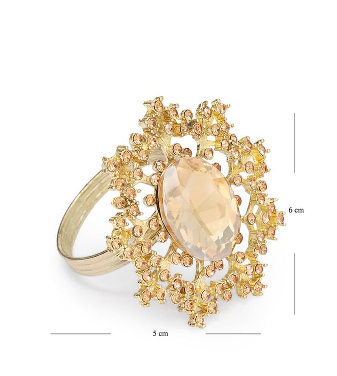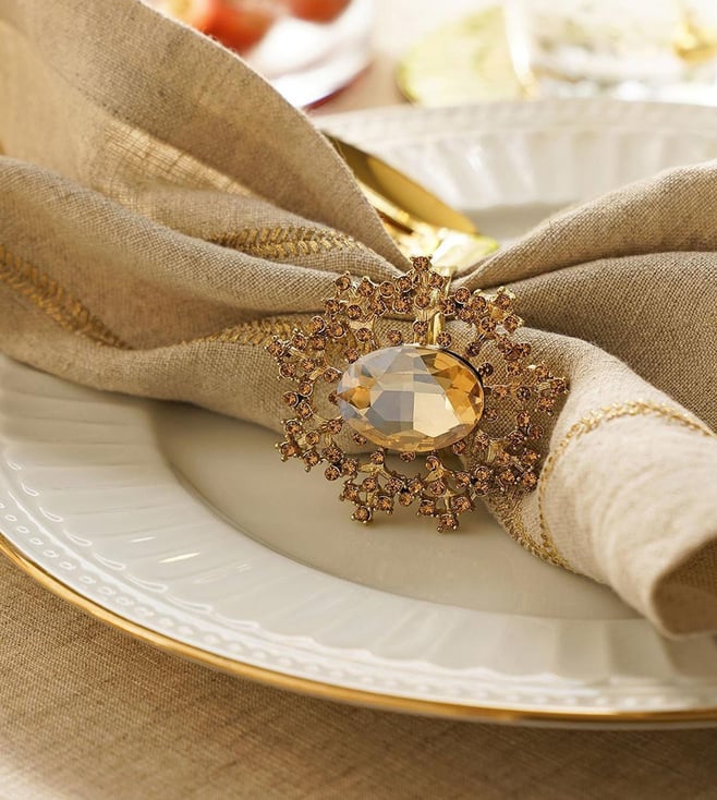 Add a touch of elegance to your dining experience with Pure Home and Living's Gold Brass Embellished Napkin Rings. Made of high-quality brass, zinc, and crystal materials, perfect for any occasion.' Disclaimer: All other items in the image are only for display purposes and will not be a part of the delivery content. Product colour may slightly vary due to photographic lighting sources. Country of Origin - India.