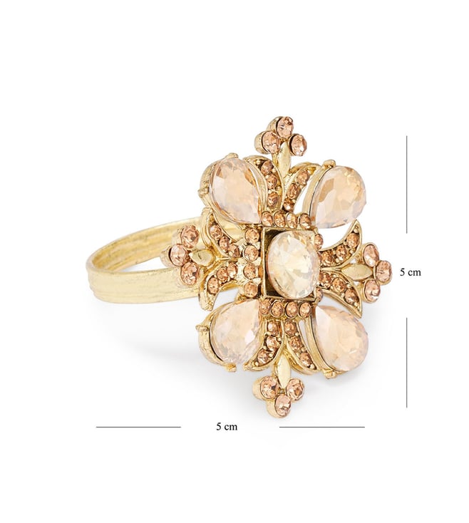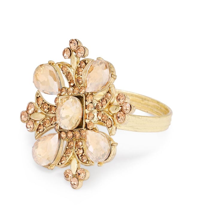 Add a touch of elegance to your table setting with these embellished napkin rings from Pure Home and Living. Crafted from brass and zinc, each ring is adorned with sparkling crystals in a luxurious gold finish. Perfect for special occasions or everyday use.' Disclaimer: All other items in the image are only for display purposes and will not be a part of the delivery content. Product colour may slightly vary due to photographic lighting sources. Country of Origin - India.
