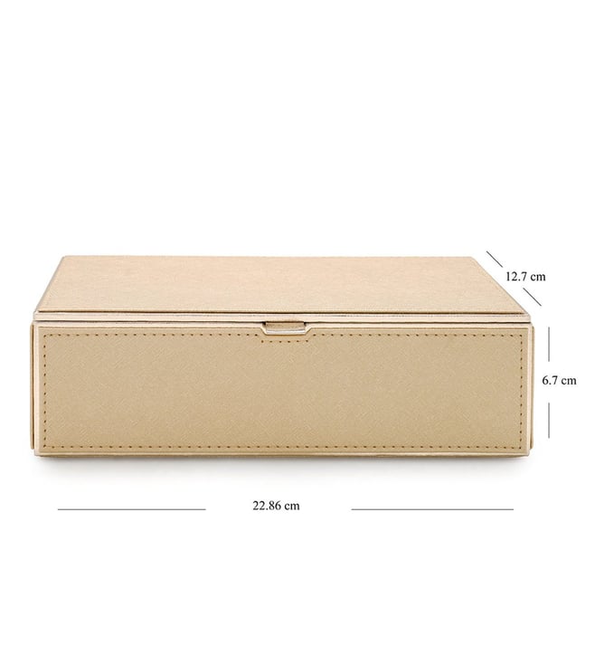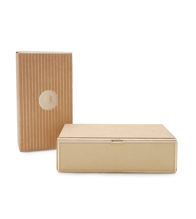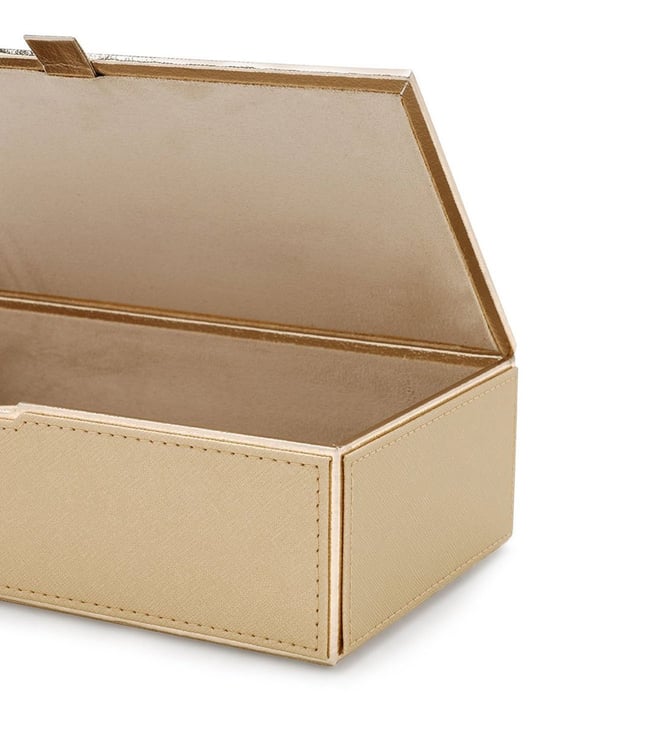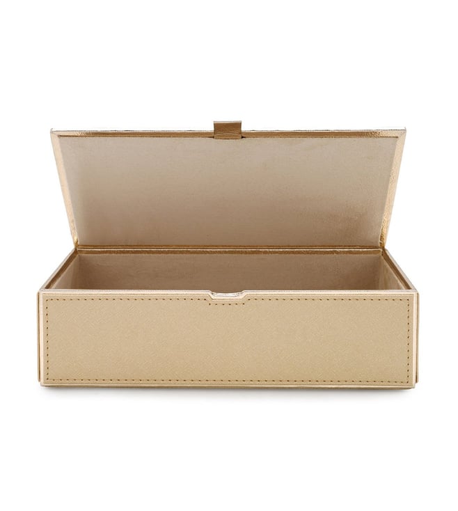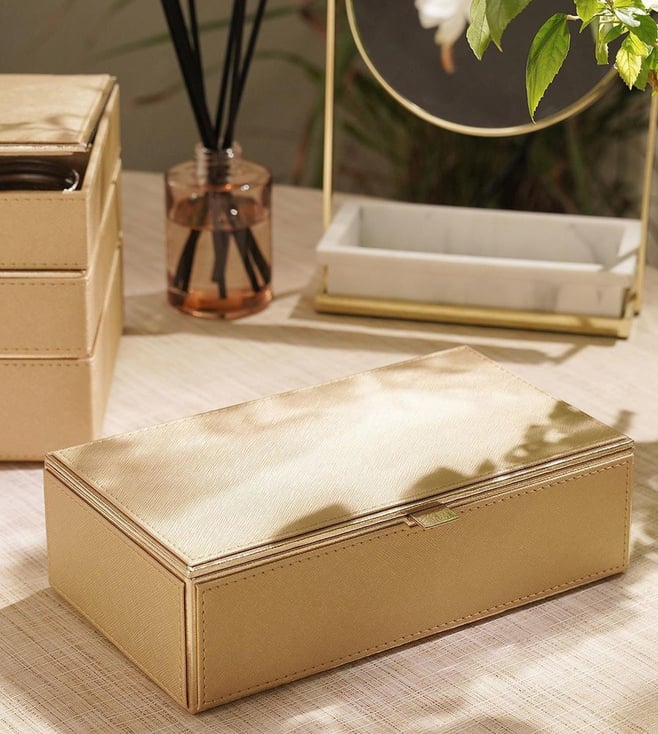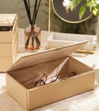Store your essentials in style with Pure Home and Living gold MDF solid storage boxes. Made with MDF, faux leather, and suede fabric, suitable for any occasion. Instructions included.' Disclaimer: All other items in the image are only for display purposes and will not be a part of the delivery content. Product colour may slightly vary due to photographic lighting sources. Country of Origin - India.
