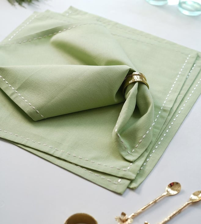 Enhance your dining experience with Pure Home and Living's Green Cotton Solid Table Napkins. Perfect for any occasion or home.' Disclaimer: All other items in the image are only for display purposes and will not be a part of the delivery content. Product colour may slightly vary due to photographic lighting sources. Country of Origin - India.
