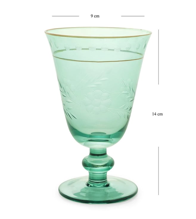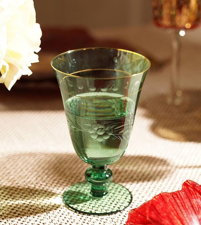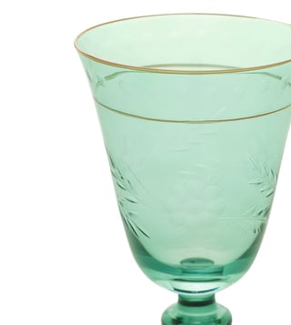 Elevate your dining experience with Pure Home and Living Green Glass Floral Wine Glasses. Perfect for any occasion, designed to enhance your home decor. #GreenGlass #FloralWineGlasses' Disclaimer: All other items in the image are only for display purposes and will not be a part of the delivery content. Product colour may slightly vary due to photographic lighting sources. Country of Origin - India.