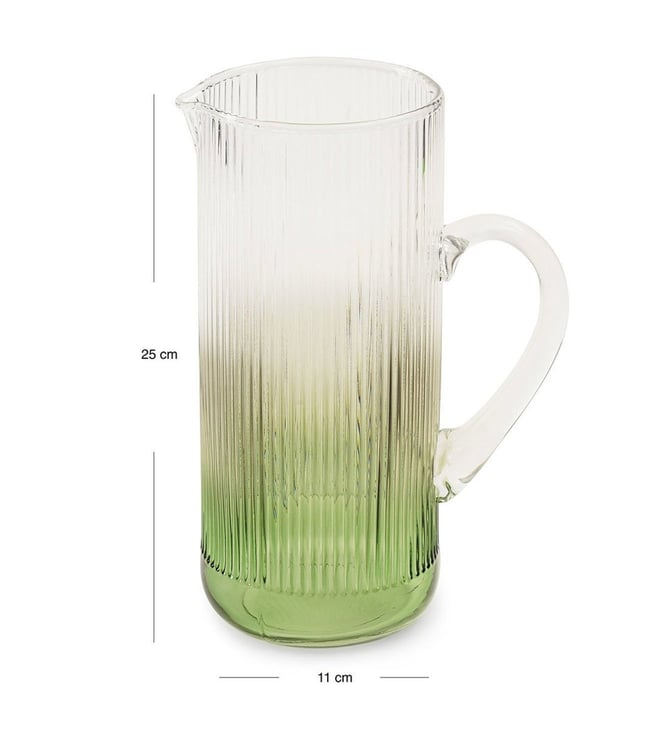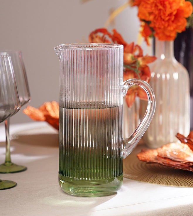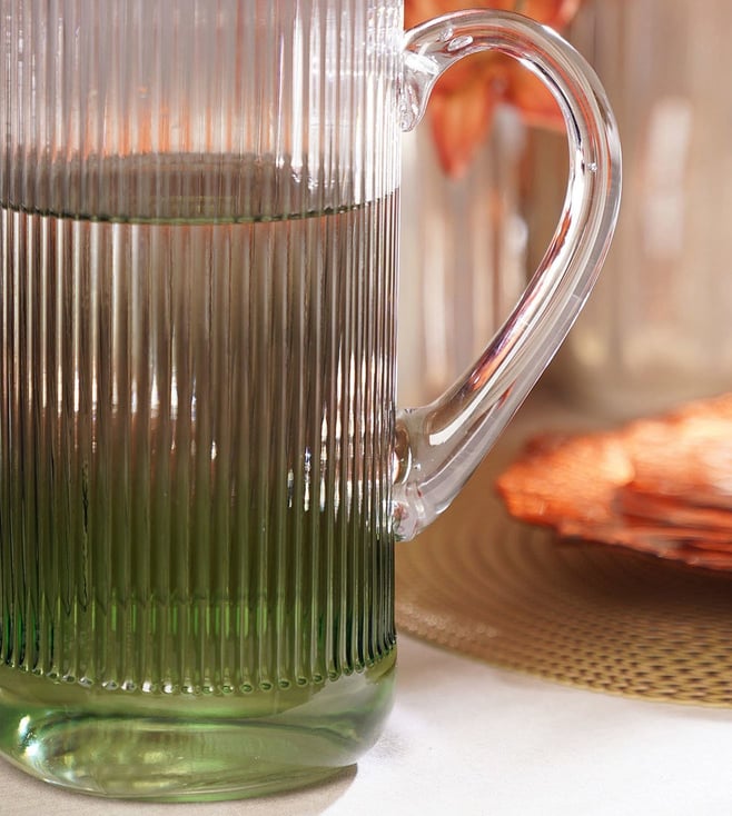 The Pure Home and Living Green Glass Water Jugs add a touch of elegance to your home. Perfect for serving beverages with a stylish flair. Durable and chic. Disclaimer: All other items in the image are only for display purposes and will not be a part of the delivery content. Product colour may slightly vary due to photographic lighting sources. Country of Origin - India.