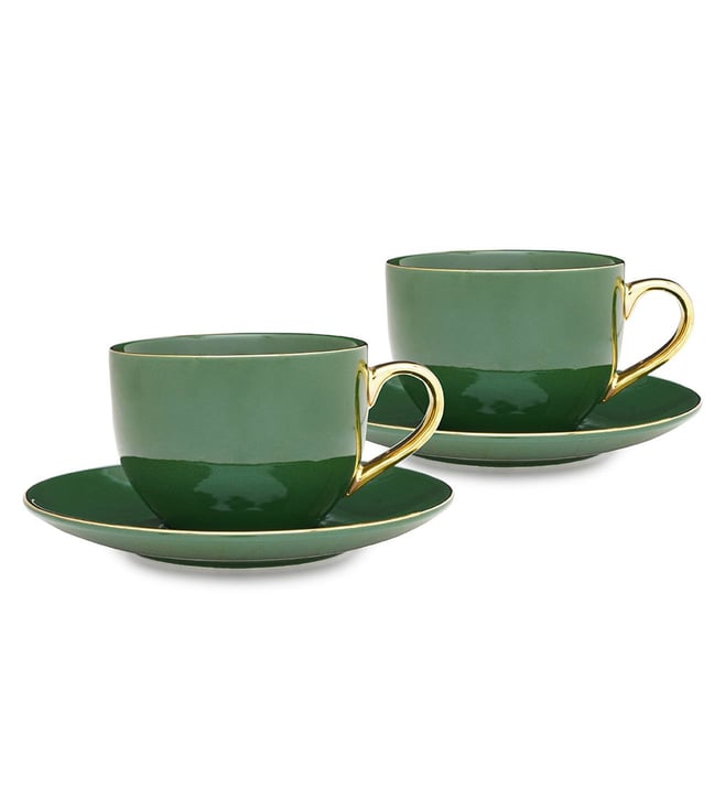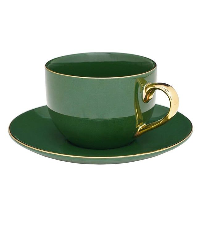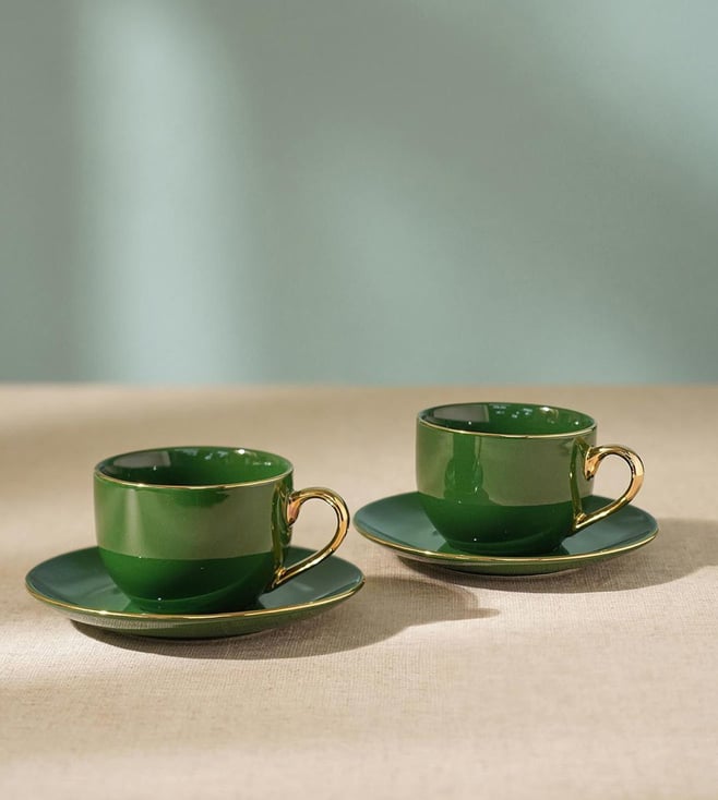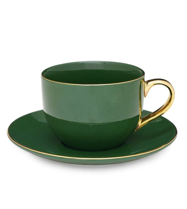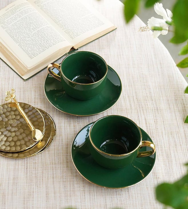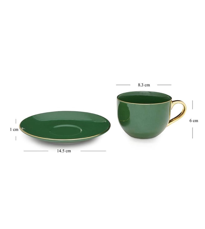 Sip your tea in style with these elegant green porcelain tea cups and saucer set from Pure Home and Living. Perfect for any occasion.' Disclaimer: All other items in the image are only for display purposes and will not be a part of the delivery content. Product colour may slightly vary due to photographic lighting sources. Country of Origin - India.
