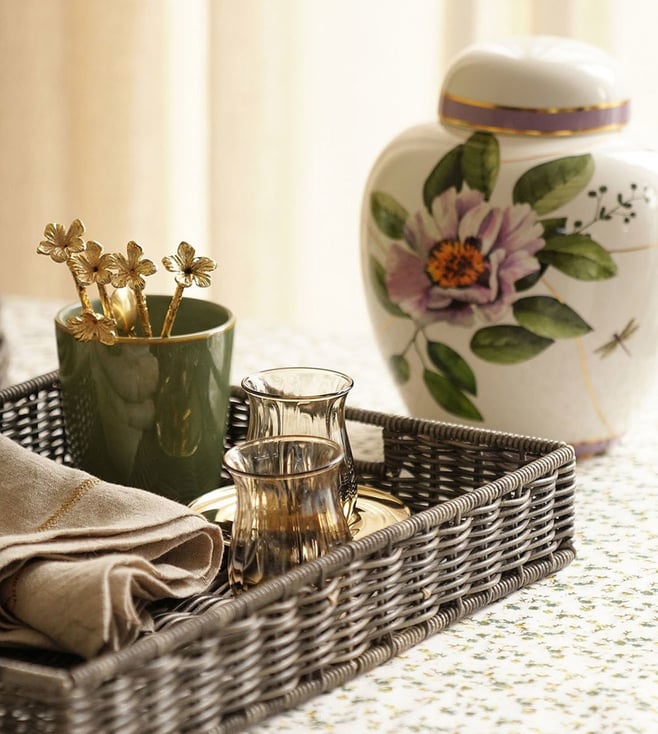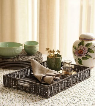 Elegant Pure Home and Living Grey Plastic Wicker Tray. Perfect for special occasions like New Year, Diwali, Mother's Day, weddings, birthdays, and anniversaries. Made from high-quality wicker material.'Disclaimer: All other items in the image are only for display purposes and will not be a part of the delivery content. Product colour may slightly vary due to photographic lighting sources. Country of Origin - India.