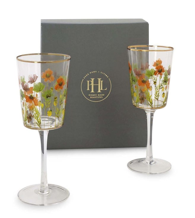 Elevate your table setting with this set of 2 floral print wine glasses from Pure Home and Living. The charming floral print adds a touch of charm and sophistication to your beverage experience. It is crafted with care using glass. These glasses with sober design will look elegant in any setting.